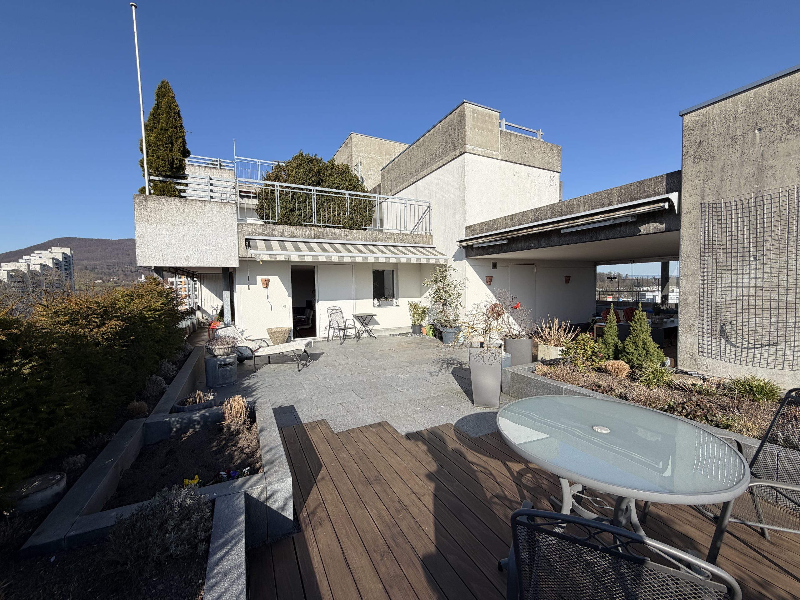 Das Highlight der Wohnung ist die ca. 71 m² grosse Dachterrasse mit überdachtem Sitzplatz – ein perfekter Ort für entspannte Stunden, gemütliche Abende mit Freunden oder sonnige Wochenenden. Von dort aus geniessen Sie einen traumhaften Ausblick über Aarau, die Aare Landschaft und den Jura.