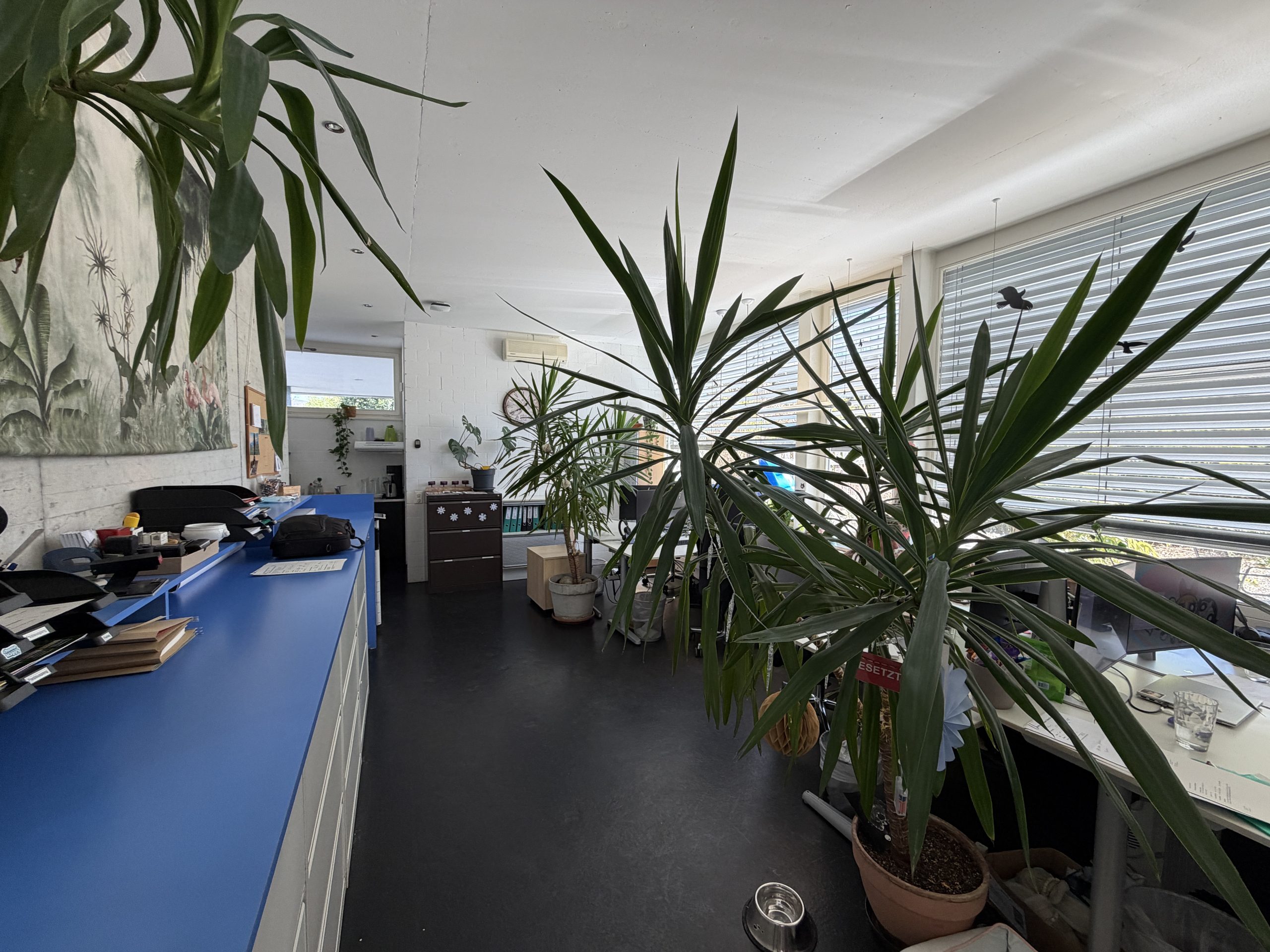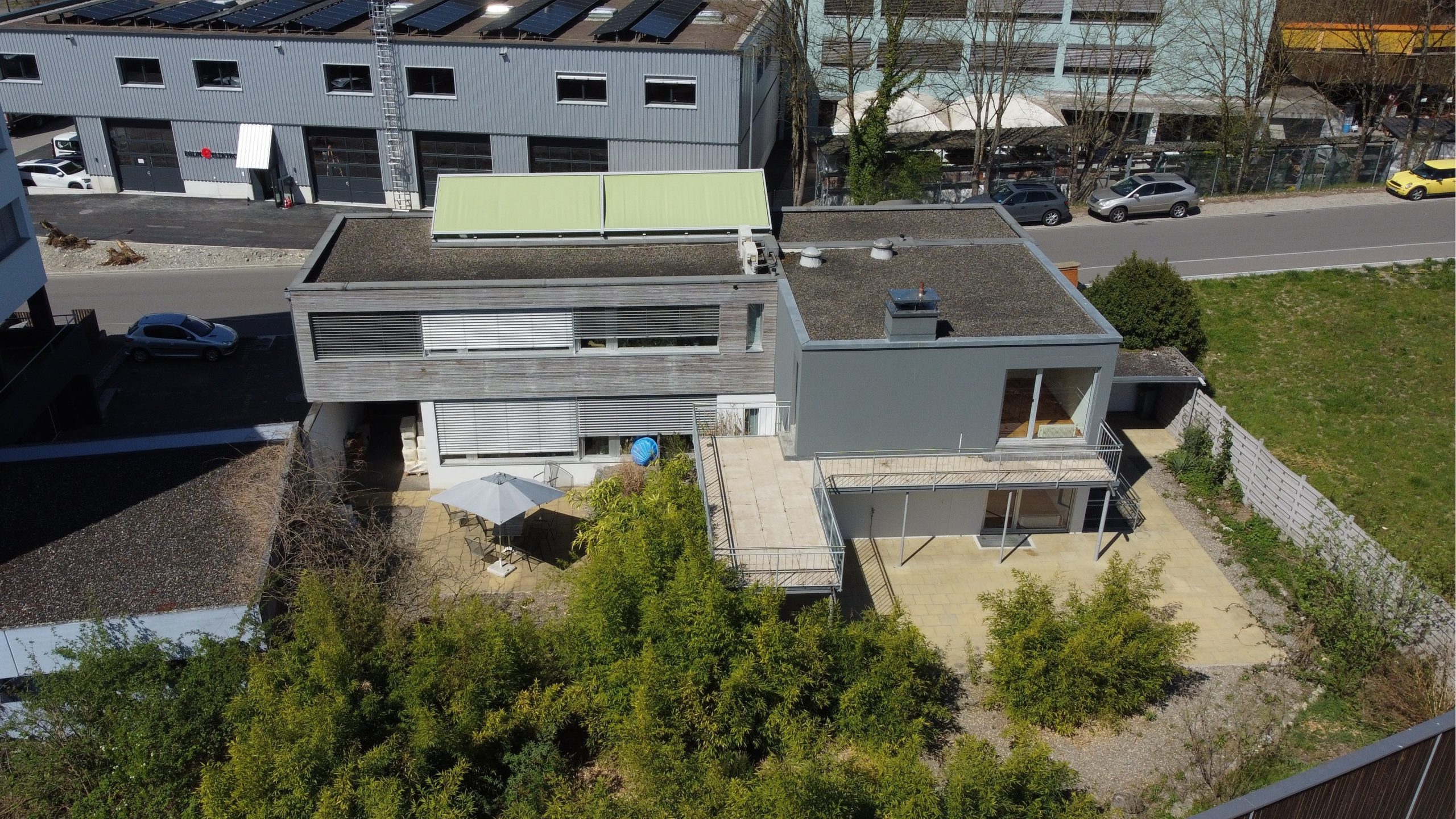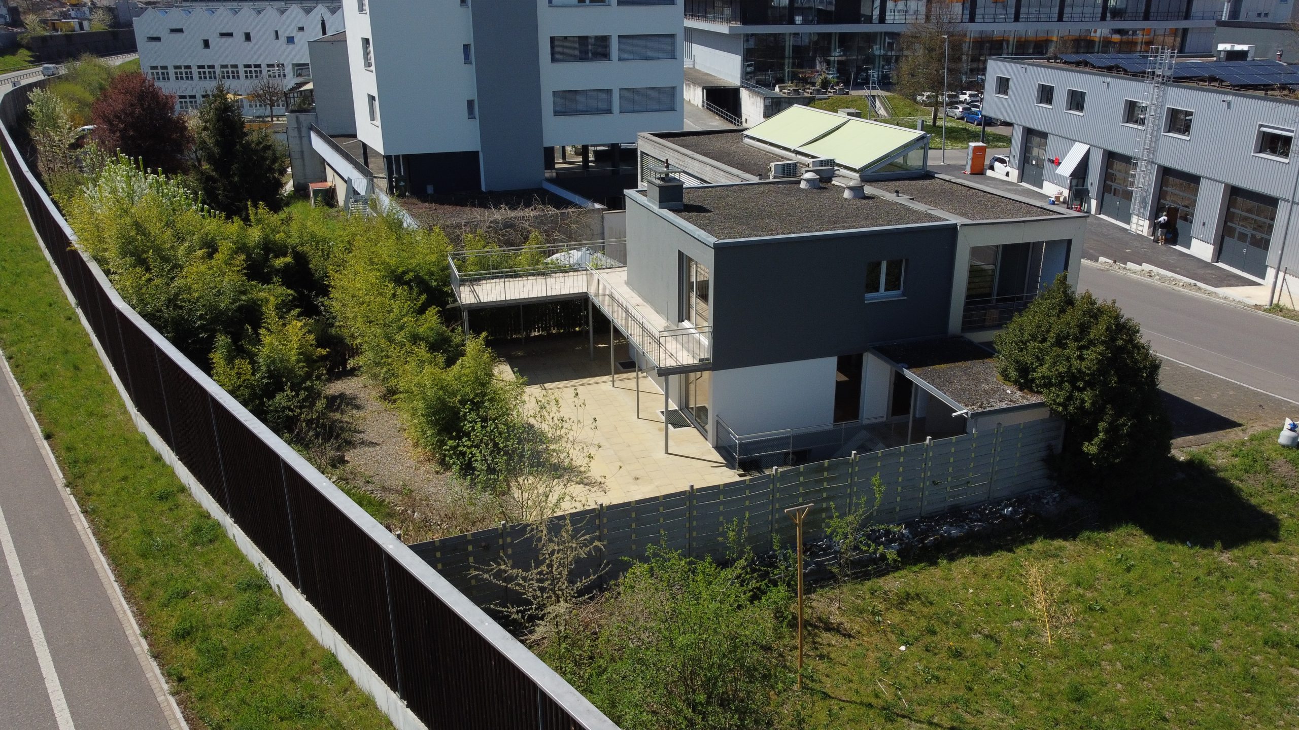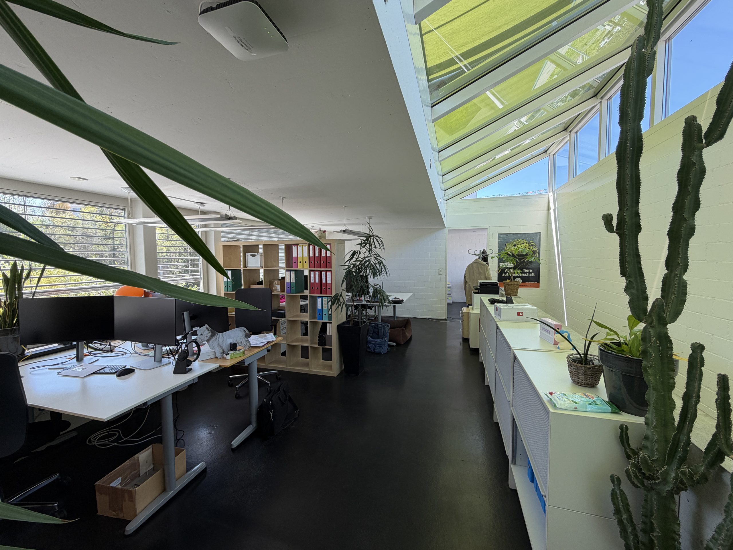 Der Bürotrakt erstreckt sich ebenfalls über zwei Ebenen mit Grossraumbüros, Einzelbüro, Sitzungszimmer, Teeküche und direktem Zugang zum Garten. Helle Räume, robuste Materialien, Klimageräte und Sonnenschutz sorgen für angenehmen Arbeitskomfort. Die Liegenschaft wurde 2003 umfassend saniert, die Gasheizung 2018 erneuert.